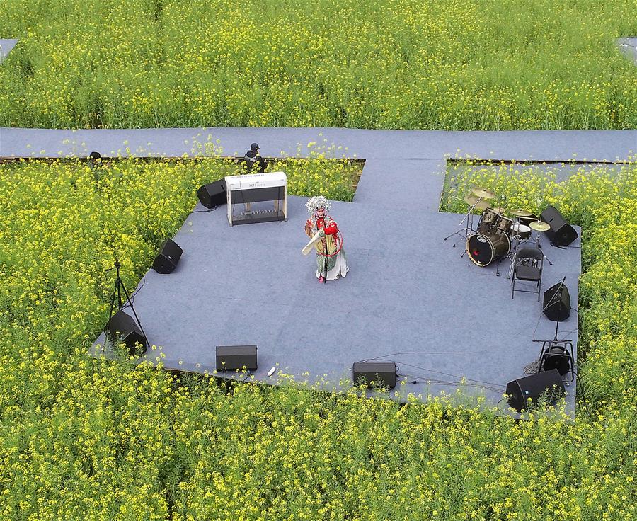 3月16日,演員在李坑村的“花田音樂會”上表演戲曲(無人機照片)。 新華社記者 萬象 攝