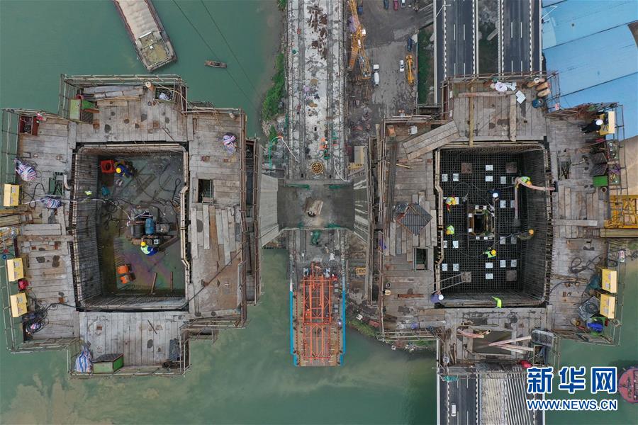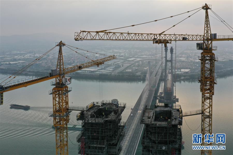 3月18日拍攝的廣州南沙港鐵路跨西江斜拉橋主塔封頂施工現(xiàn)場(無人機(jī)照片)。當(dāng)日,中鐵十一局承建的粵港澳大灣區(qū)重點工程——廣州南沙港鐵路跨西江斜拉橋主塔封頂,大橋整體建設(shè)取得重要進(jìn)展。該橋位于廣東佛山市和江門市交界處,全長1117.5米。新華社記者劉大偉攝
