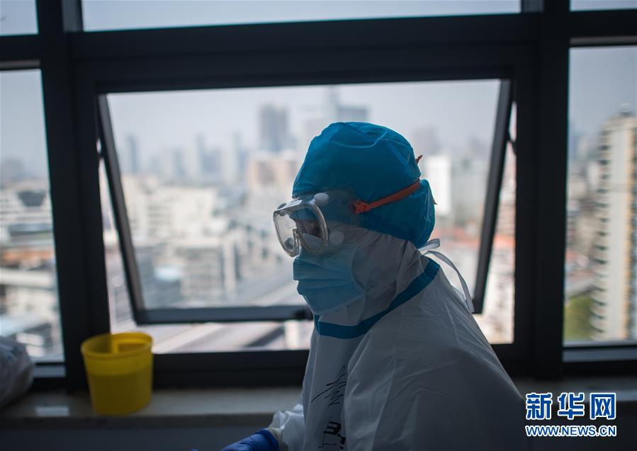 3月19日,在武漢市肺科醫(yī)院隔離病房,海南醫(yī)療隊隊員詹才露在現場忙碌。 新華社記者 肖藝九 攝