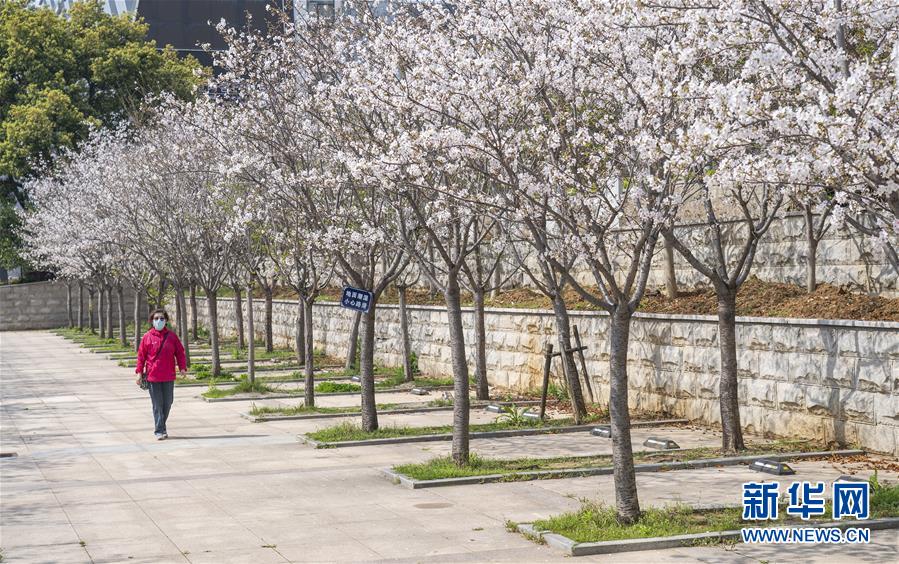 3月19日,在武漢市武昌區(qū)被網(wǎng)友稱為“武漢最美停車場”的湖北日報停車場,一名工作人員從櫻花樹邊經(jīng)過。 新華社記者 才揚(yáng) 攝