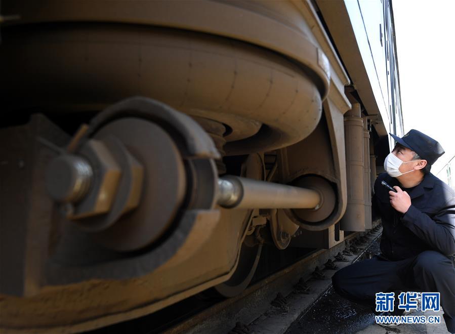 3月19日,鄭州車輛段客車檢車員在檢查客車車鉤鉤身。新華社記者 李安 攝