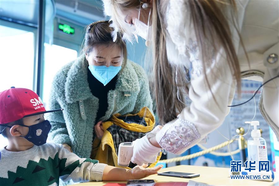 3月23日,在哈爾濱極地館入口,工作人員在給游客測(cè)量體溫。當(dāng)日,哈爾濱極地館恢復(fù)營(yíng)業(yè)。目前,極地館日接待人數(shù)不超過(guò)400人,園區(qū)采取分時(shí)段、間隔性辦法安排游客有序入園。游客實(shí)名預(yù)訂門票,入園要配合測(cè)溫、佩戴口罩、掃描“龍江健康碼”,刷身份證入館。新華社記者王建威攝