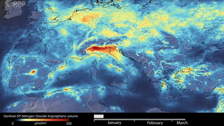 動(dòng)圖說明:歐洲航天局衛(wèi)星日前監(jiān)測(cè)到,疫情期間意大利二氧化氮等污染氣體排放量明顯下降(衛(wèi)星:Sentinel-5P)。衛(wèi)星攜帶的各類傳感器能夠采集空氣中懸浮物顆粒的電磁波信號(hào),從而對(duì)空氣質(zhì)量做出分析判斷。圖中的黃色代表二氧化氮等污染氣體的濃度。