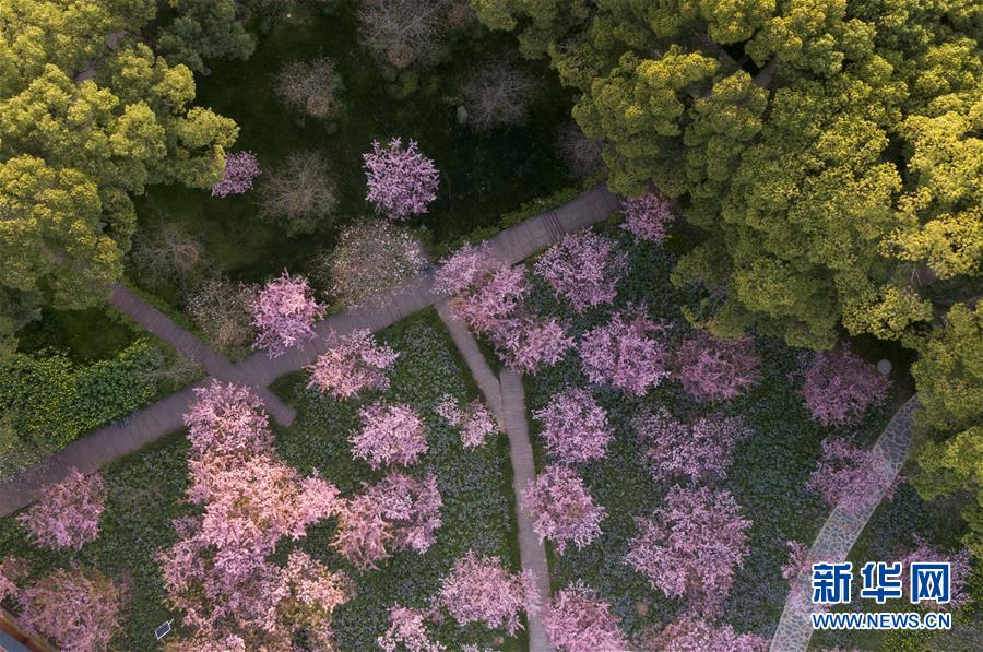 這是3月14日拍攝的武漢東湖磨山櫻園景色(無(wú)人機(jī)照片)。近日氣溫漸升,武漢東湖磨山櫻園里的櫻花漸次盛開(kāi),帶來(lái)春天的氣息。新華社記者熊琦攝