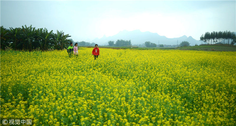 2019年2月5日,廣西來賓,當(dāng)天是農(nóng)歷大年初一,人們?cè)谛贸强h城關(guān)鎮(zhèn)隆光村油菜花海中賞花游玩。