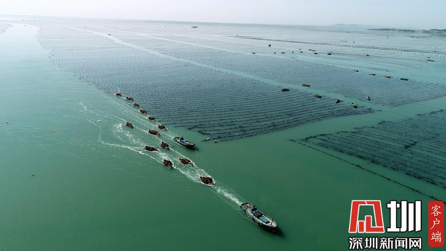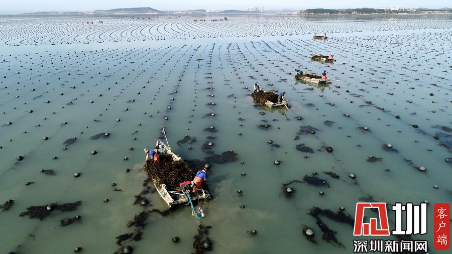 目前正是遼寧省大連市長??h扇貝和魚類收獲的季節(jié),長??h小長山島海域經(jīng)典國家級海洋牧場呈現(xiàn)出一片繁忙的豐收景象。
