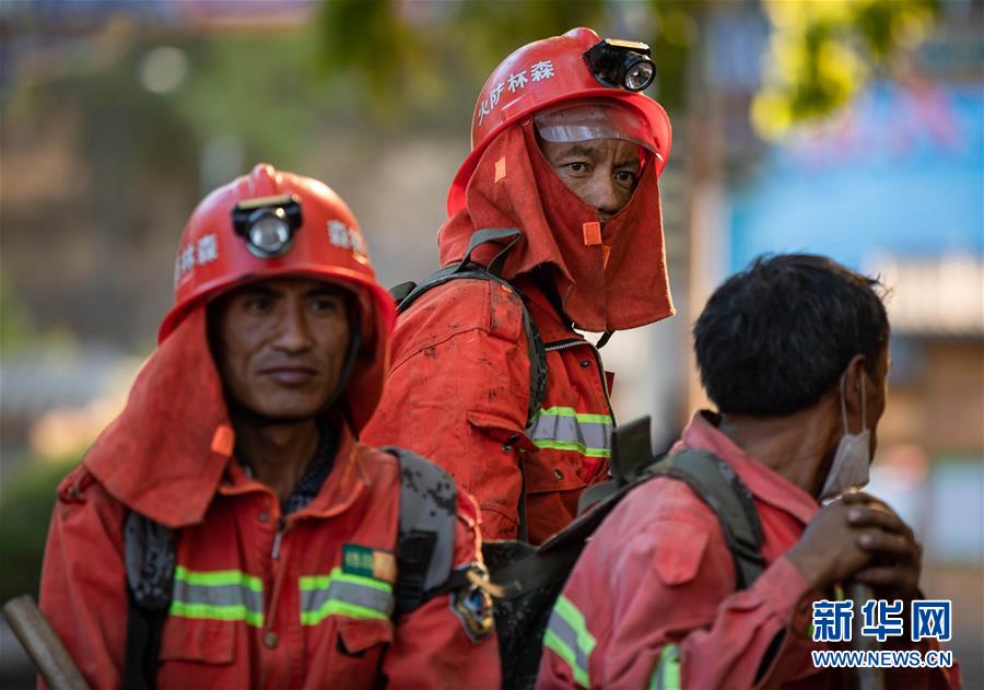 3月31日,幾名剛從火災(zāi)現(xiàn)場撤下來的撲火隊員在休整。新華社記者江宏景攝