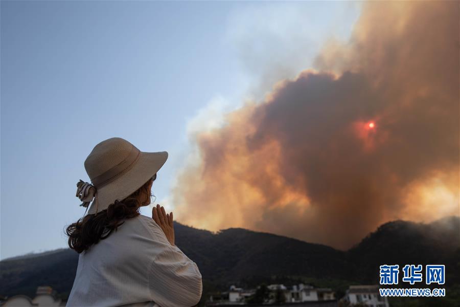 3月31日,一名女士遠望著火災(zāi)現(xiàn)場祈禱。新華社記者江宏景攝