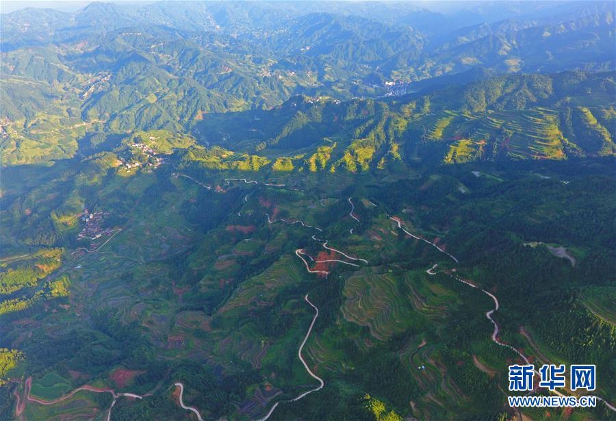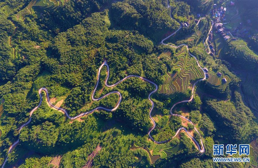 這是融水苗族自治縣桿洞鄉(xiāng)百秀村孔門苗寨的公路(6月14日無人機拍攝)。新華社記者黃孝邦攝