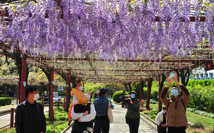 2020年4月5日,上海,每年的4月上旬至5月初是觀賞紫藤花的最佳時(shí)期。清明小長假里,晴好天氣使嘉定紫藤園迎來了不少市民游客。今年的紫藤公園采取提前預(yù)約和亮相綠色隨申碼的舉措入園賞花。公園擁有26個(gè)品種的紫藤花,盛開時(shí)期的紫藤花穗最長可達(dá)1米多?;ㄉ凶?,粉,白等,形成的花瀑宛若一簾幽夢,雅致春意今人流連忘返。
