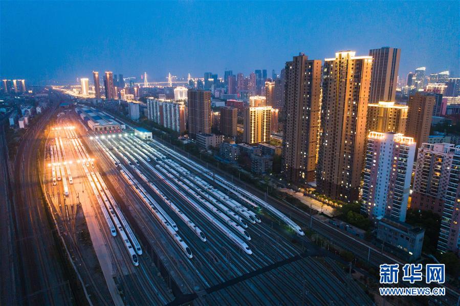 4月7日,在武漢動(dòng)車(chē)段,列車(chē)??吭诖孳?chē)線上(無(wú)人機(jī)照片)。新華社記者 沈伯韓 攝
