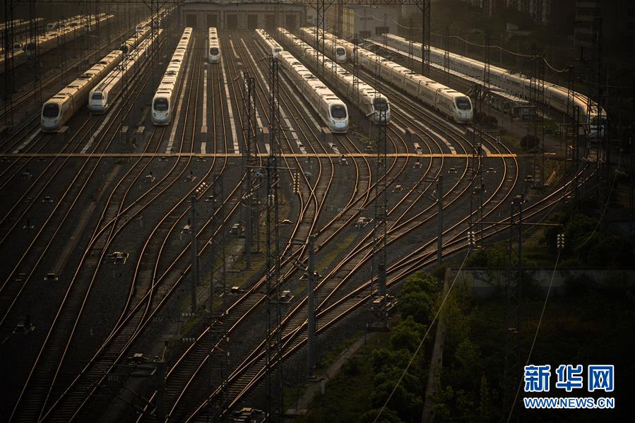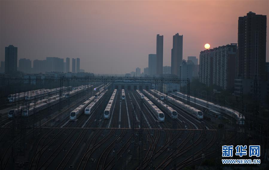 4月8日,在武漢動(dòng)車段,列車??吭诖孳嚲€上準(zhǔn)備投入運(yùn)行。 新華社記者 肖藝九 攝