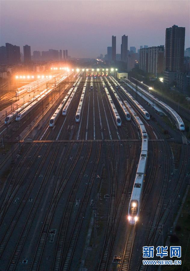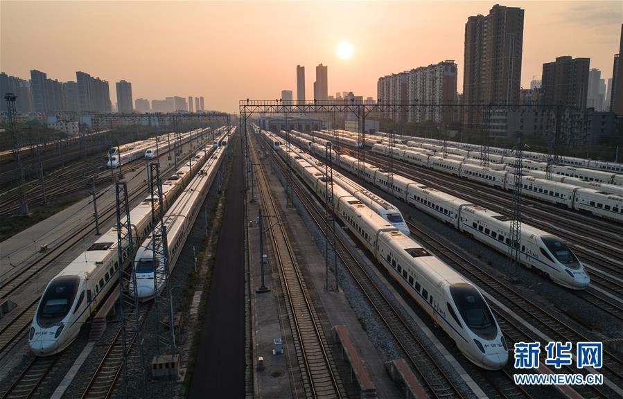 4月8日,在武漢動(dòng)車段,列車停靠在存車線上準(zhǔn)備投入運(yùn)行(無人機(jī)照片)。 新華社記者 肖藝九 攝