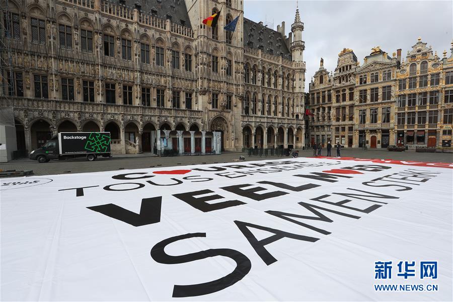 這是4月13日在比利時布魯塞爾大廣場拍攝的為抗擊疫情加油的巨幅海報。當(dāng)日,比利時布魯塞爾市政府工作人員在市中心的大廣場展開一面巨幅海報,上面用法語和荷蘭語印著“一起鼓起勇氣”“謝謝”,以感謝市民及醫(yī)療人員為抗擊疫情所做的努力。新華社記者鄭煥松攝