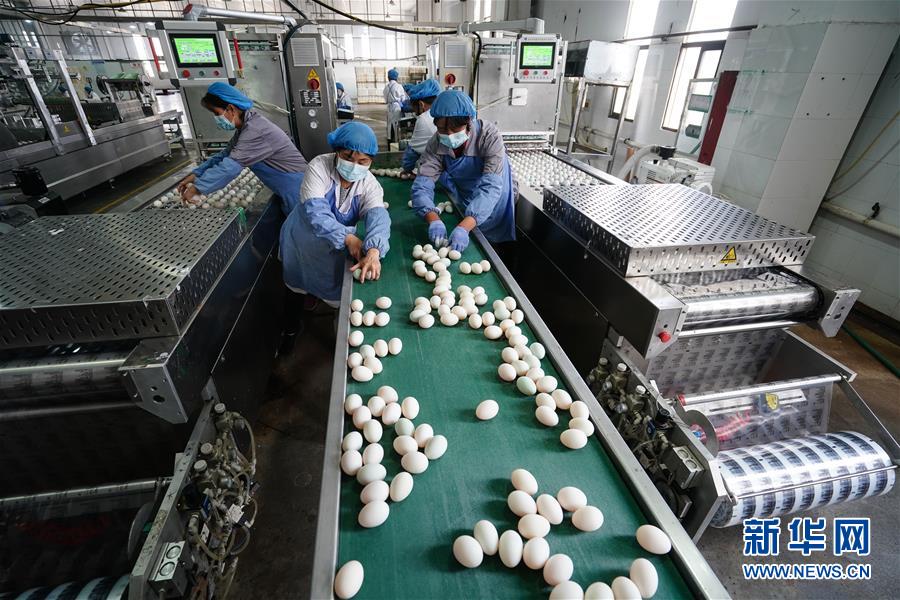 江蘇高郵鴨集團的工作人員將腌制好的鴨蛋放到塑封包裝流水線上(4月15日攝)?!案哙]鴨蛋”是江蘇高郵的特色農業(yè)名片。近年來,當地在良種繁育、生態(tài)養(yǎng)殖、產品加工等方面加大力度,推動高郵鴨蛋品牌化建設,讓小鴨蛋成為帶動農戶致富的大產業(yè)。2019年,高郵市共計生產熟制鴨蛋產品近11.2億枚,年產值近17.68億元。新華社記者李博攝