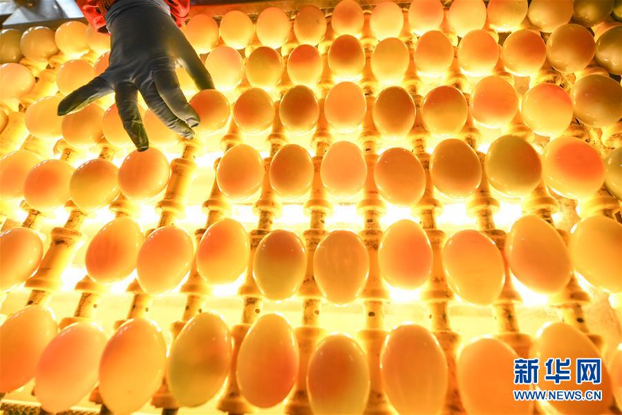 江蘇高郵鴨集團的工作人員在生產線上對鴨蛋進行光檢作業(yè)(4月15日攝)?!案哙]鴨蛋”是江蘇高郵的特色農業(yè)名片。近年來,當地在良種繁育、生態(tài)養(yǎng)殖、產品加工等方面加大力度,推動高郵鴨蛋品牌化建設,讓小鴨蛋成為帶動農戶致富的大產業(yè)。2019年,高郵市共計生產熟制鴨蛋產品近11.2億枚,年產值近17.68億元。新華社記者李博攝