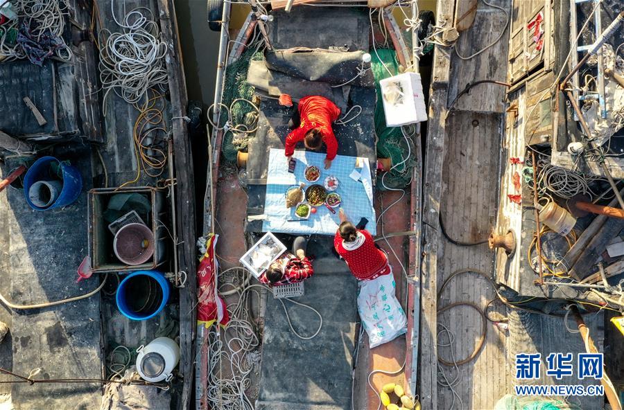 4月22日,馬花雨(下右)、徐紅紅(上)、陸倩(下左)在漁船上拍攝推銷海產(chǎn)品的短視頻。近年來,江蘇省連云港市贛榆區(qū)海頭鎮(zhèn)越來越多的居民開始直播銷售海產(chǎn)品,當(dāng)?shù)貪O船、碼頭和市場(chǎng)上活躍著一批網(wǎng)絡(luò)直播好手。目前,全鎮(zhèn)有3000多戶商家從事海產(chǎn)品直播銷售業(yè)務(wù),形成了集捕撈、加工、包裝、銷售和物流于一體的電商產(chǎn)業(yè)鏈。新華社記者楊磊攝