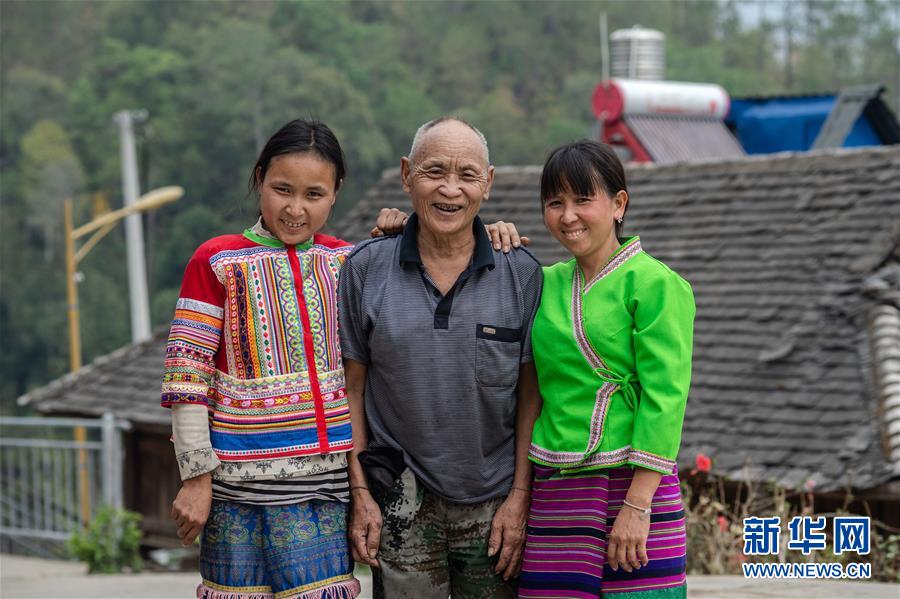 在云南省勐??h布朗山鄉(xiāng)曼囡村曼班三隊(duì),娜四(右)和父親(中)、妹妹在村里合影(4月12日攝)。新華社記者胡超攝