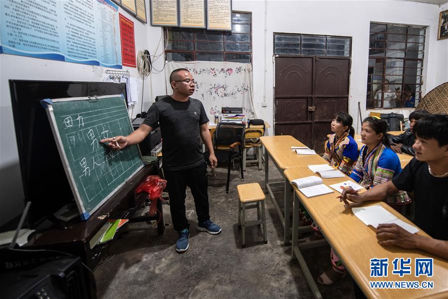4月10日,在云南省勐??h布朗山鄉(xiāng)曼囡村曼班三隊(duì),娜四在村里上夜校。新華社記者胡超攝
