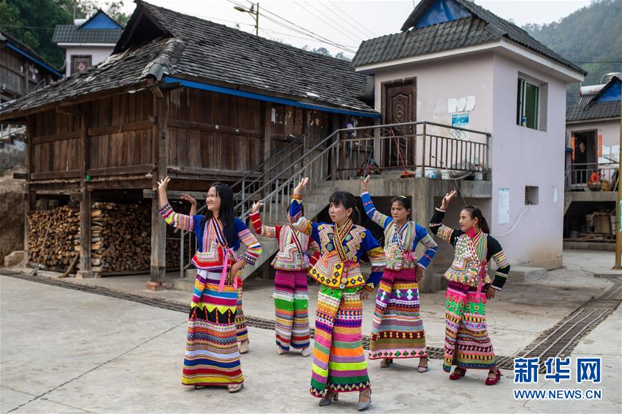 4月10日,在云南省勐??h布朗山鄉(xiāng)曼囡村曼班三隊(duì),娜四(中)和村民一起跳舞。新華社記者胡超攝