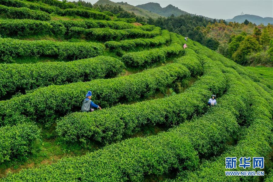 4月25日,茶農(nóng)在“扶貧茶園”內采茶(無人機照片)。谷雨過后,在貴州省黔東南苗族侗族自治州丹寨縣“扶貧茶園”,茶農(nóng)搶抓農(nóng)時趕制春茶。丹寨縣創(chuàng)新產(chǎn)業(yè)扶貧模式,鼓勵社會公眾線上認領茶園,再由茶園聘請當?shù)刎毨魟展?,為貧困戶?chuàng)造茶園管理、采茶、制茶等就業(yè)機會,幫助貧困戶增收。今年以來,“扶貧茶園”已接受線上預訂600余畝,給當?shù)?00余名村民提供了就業(yè)機會。新華社記者歐東衢攝