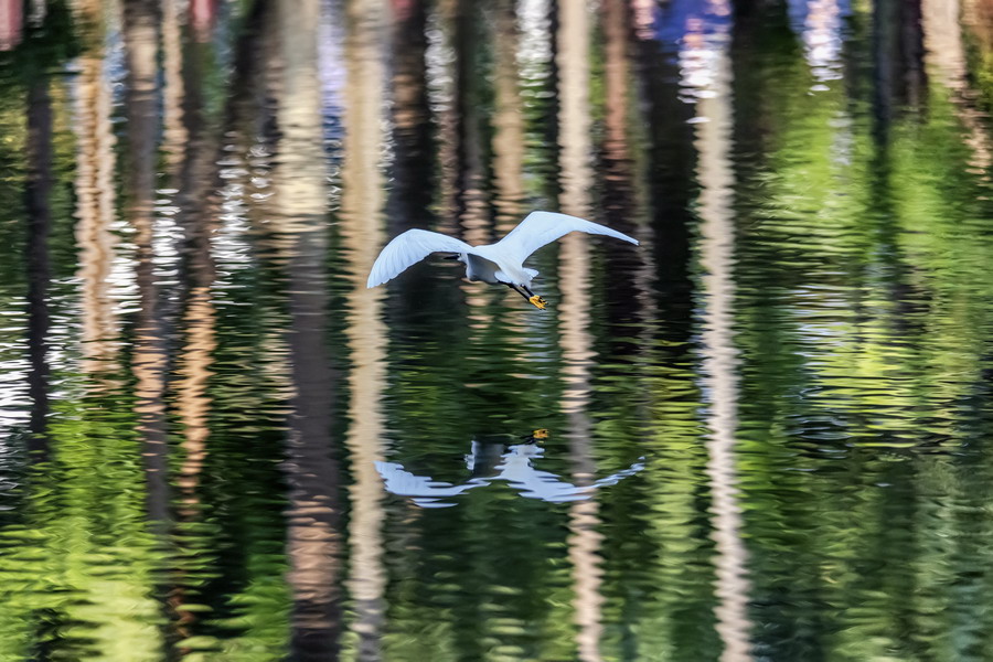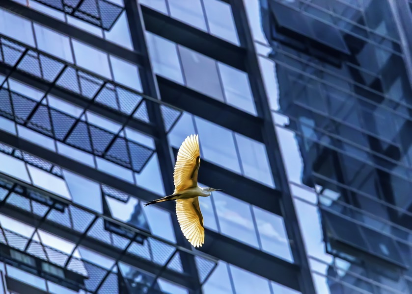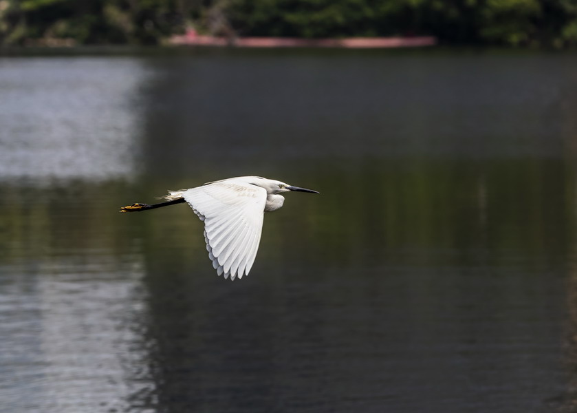 4月15日,攝于南山區(qū)華僑城天鵝堡附近。這是深圳拍鷺鳥的其中一個好去處。白鷺飛行時頭往回縮至肩背處,頸向下曲成袋狀,兩腳向后伸直,遠遠突出于尾后,兩翅緩慢地鼓動飛翔。徐捷攝