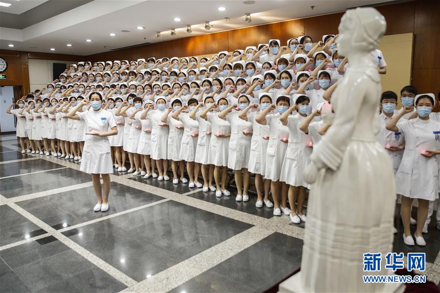 4月26日,北京大學人民醫(yī)院新入職護士參加授帽儀式時重溫南丁格爾誓言。當日,北京大學人民醫(yī)院為97名2019屆新入職護士舉行隆重莊嚴的授帽儀式和重溫南丁格爾誓言的活動,以此紀念南丁格爾誕辰200周年和即將到來的“國際護士節(jié)”?;顒舆€邀請了5名援鄂國家醫(yī)療隊護士代表分享戰(zhàn)“疫”故事。新華社記者張玉薇攝