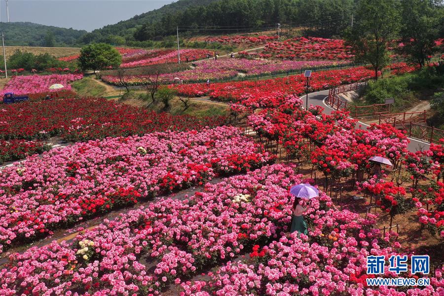 5月2日,市民在河北唐山遵化市小廠鄉(xiāng)一處農(nóng)業(yè)觀光園賞花游玩(無人機照片)?!拔逡弧奔偃掌陂g,人們以多種方式放松心情、享受假日。新華社發(fā)(劉滿倉攝)