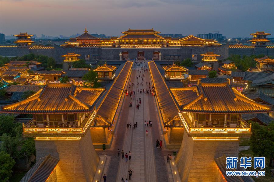 5月1日,游客在湖北省襄陽市唐城景區(qū)觀賞夜景(無人機照片)?!拔逡弧奔偃掌陂g,人們以多種方式放松心情、享受假日。新華社發(fā)(楊東攝)