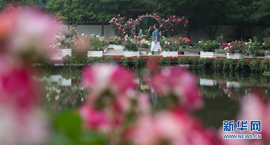 5月5日,游客在西湖畔的郭莊觀看月季花展。“五一”期間,第八屆杭州西湖月季花精品展在杭州西子湖畔舉行,展出國內(nèi)外700余個月季品種。新華社記者翁忻旸攝