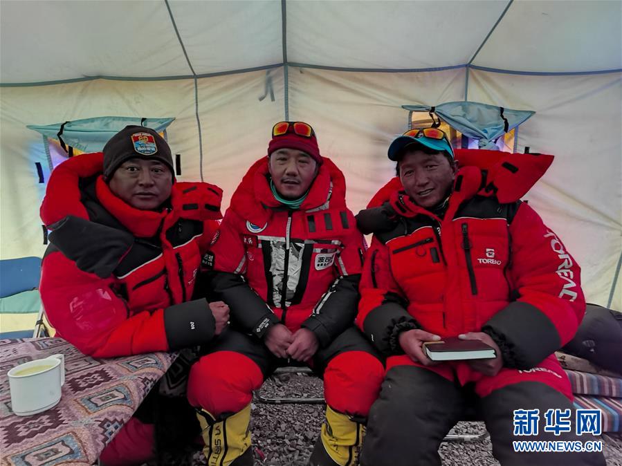 5月7日,在海拔6500米的珠峰前進(jìn)營地,測量登山隊(duì)隊(duì)長次洛(中)與旺青索朗(左)、魯達(dá)(右)在協(xié)調(diào)會議現(xiàn)場。新華社特約記者扎西次仁攝