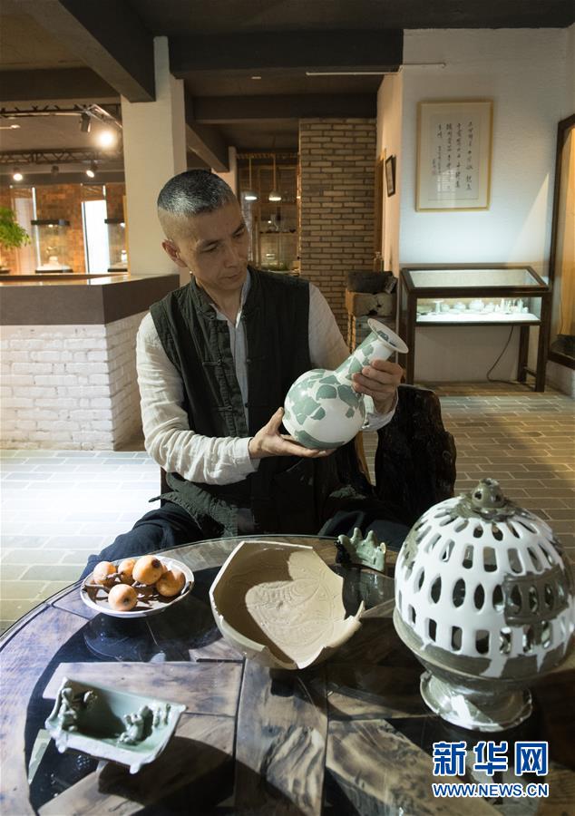 5月8日,項(xiàng)宏金在龍泉青瓷裝飾紋樣研究所查看自己收藏的一些古瓷器。1965年出生的項(xiàng)宏金,被浙江龍泉年輕一代瓷人稱為“項(xiàng)哥”,他從20世紀(jì)90年代開(kāi)始收集龍泉青瓷標(biāo)本,研究青瓷紋樣。2014年出版著作《龍泉青瓷裝飾紋樣》,次年開(kāi)設(shè)龍泉青瓷裝飾紋樣研究所,將自己收藏的千余件標(biāo)本跟瓷器愛(ài)好者、創(chuàng)作者免費(fèi)分享。新華社記者翁忻旸攝