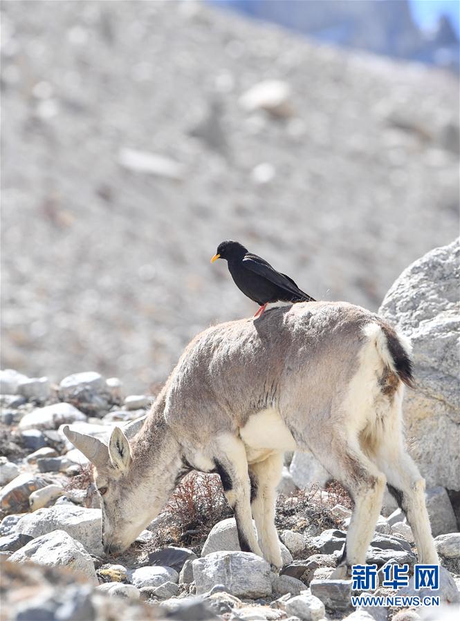 黃嘴山鴉停留在巖羊身上(5月8日攝)。當(dāng)日,一群巖羊在珠峰大本營周圍覓食,黃嘴山鴉飛到巖羊身上停留,構(gòu)成一幅幅生動有趣的雪域圖畫。新華社記者晉美多吉攝