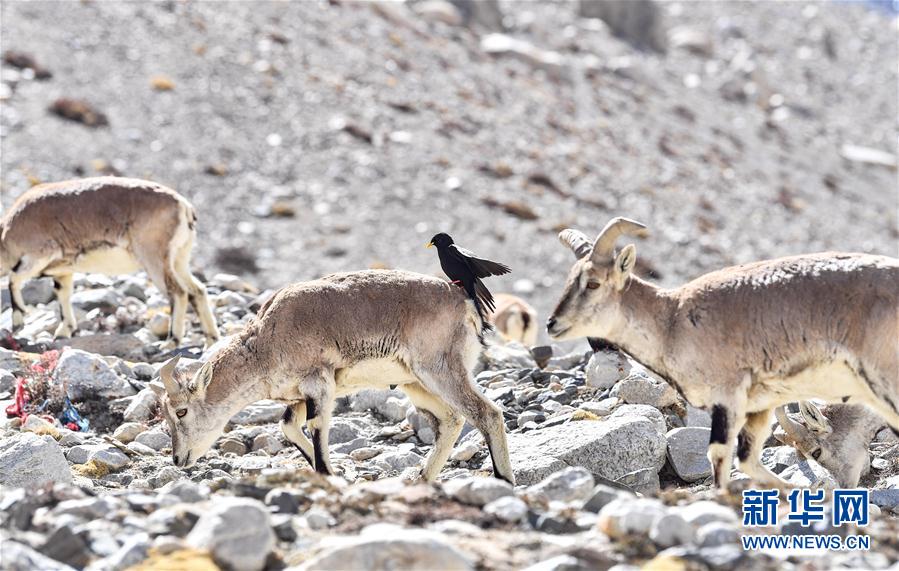 一只黃嘴山鴉停留在巖羊身上(5月8日攝)。當(dāng)日,一群巖羊在珠峰大本營周圍覓食,黃嘴山鴉飛到巖羊身上停留,構(gòu)成一幅幅生動有趣的雪域圖畫。新華社記者晉美多吉攝