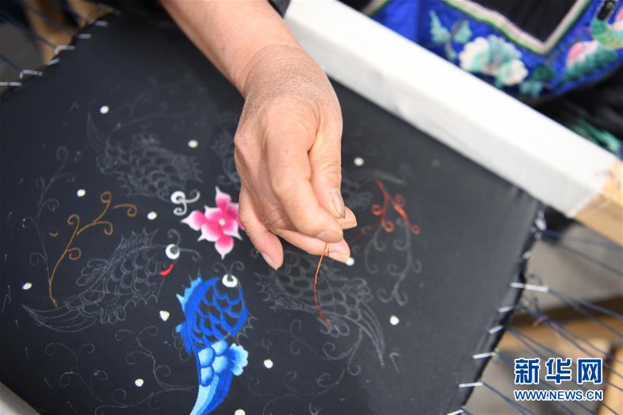 吳美金在十八洞村苗繡特產農民專業(yè)合作社繡苗繡(4月24日攝)。1967年出生的吳美金,1992年嫁入飛蟲村(現十八洞村飛蟲寨)時,只有爛泥路的飛蟲村不僅田土少,掙錢活路也少,生活十分困難。2014年,吳美金加入了十八洞村苗繡特產農民專業(yè)合作社,從小就會的苗繡傳統手藝如今成了家庭增收的法寶,不僅在家門口就把錢掙了,同時還能照顧年幼的孫子孫女?!艾F在的日子,比年輕的時候好多了?!眳敲澜鹫f。新華社記者薛宇舸攝