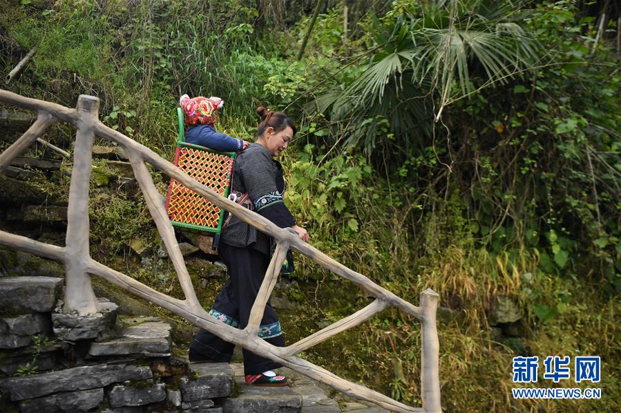 吳美金背著孫子走在十八洞村中,準備前往村里的苗繡合作社(4月24日攝)。1967年出生的吳美金,1992年嫁入飛蟲村(現十八洞村飛蟲寨)時,只有爛泥路的飛蟲村不僅田土少,掙錢活路也少,生活十分困難。2014年,吳美金加入了十八洞村苗繡特產農民專業(yè)合作社,從小就會的苗繡傳統手藝如今成了家庭增收的法寶,不僅在家門口就把錢掙了,同時還能照顧年幼的孫子孫女?!艾F在的日子,比年輕的時候好多了?!眳敲澜鹫f。新華社記者薛宇舸攝