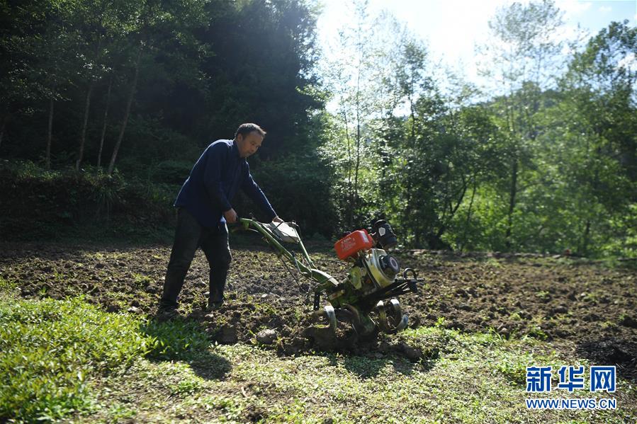 施六金在田間翻耕(4月24日攝)。1973年出生于十八洞村的施六金,由于父親患病很早就放棄學業(yè)和母親扛起了家庭的重擔。為了生活,他還曾遠去東南亞打工。2015年,看到家鄉(xiāng)的變化,施六金回到村里開起了農家樂,年度家庭人均純收入也從2014年的1715元增長到了2019年的35696元。2018年,施六金與心愛的人組建了家庭。今年初,施六金與愛人迎來了一個大胖小子?!白鋈俗鍪乱没貓蠛透卸??!笔┝鸾o剛出生的兒子取名施澤恩。新華社記者薛宇舸攝