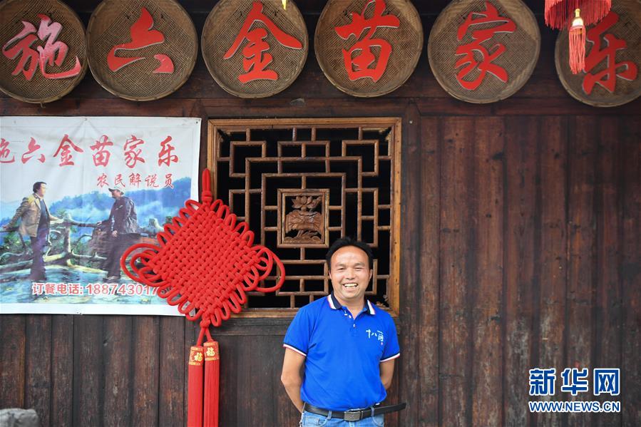 這是施六金在他的農家樂前留影(4月25日攝)。1973年出生于十八洞村的施六金,由于父親患病很早就放棄學業(yè)和母親扛起了家庭的重擔。為了生活,他還曾遠去東南亞打工。2015年,看到家鄉(xiāng)的變化,施六金回到村里開起了農家樂,年度家庭人均純收入也從2014年的1715元增長到了2019年的35696元。2018年,施六金與心愛的人組建了家庭。今年初,施六金與愛人迎來了一個大胖小子?!白鋈俗鍪乱没貓蠛透卸??!笔┝鸾o剛出生的兒子取名施澤恩。新華社記者薛宇舸攝