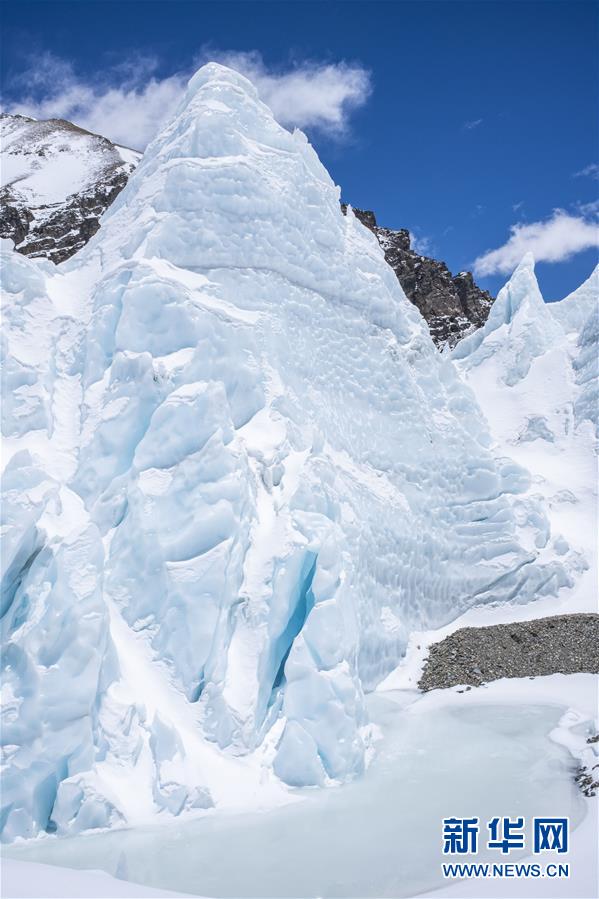 珠峰海拔5800米至海拔6500米的冰塔林(5月9日攝)。從海拔5800米的珠峰過(guò)渡營(yíng)地到海拔6500米的前進(jìn)營(yíng)地,冰塔林沿山谷排列,蔚為壯觀(guān)。新華社記者孫非攝