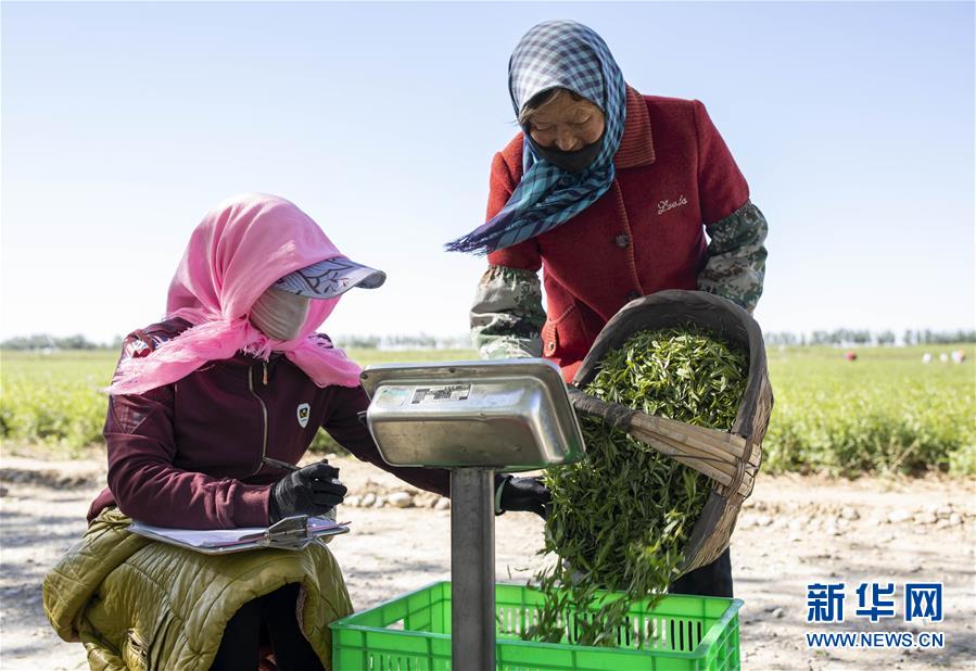 5月11日,在寧夏百瑞源賀蘭山基地,工作人員對(duì)采摘的枸杞芽茶進(jìn)行稱(chēng)重。當(dāng)日,寧夏百瑞源賀蘭山基地枸杞芽茶全面進(jìn)入采摘季。據(jù)了解,該基地茶園面積300余畝,助力附近200多名農(nóng)民就業(yè)增收。新華社記者楊植森攝