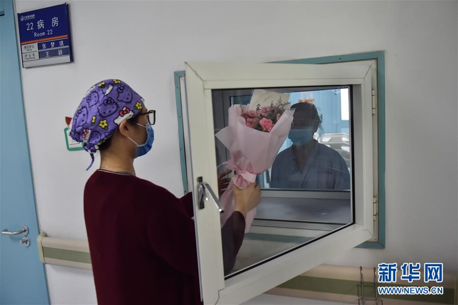 5月11日,在北京地壇醫(yī)院感染二科病房外,一名護(hù)士向病人轉(zhuǎn)交病人女兒送來的鮮花。北京地壇醫(yī)院是北京市收治新冠肺炎患者的定點醫(yī)院之一,醫(yī)院的醫(yī)護(hù)人員一直奮戰(zhàn)在抗擊疫情的一線。在國際護(hù)士節(jié)前夕,記者前往北京地壇醫(yī)院,記錄下抗疫一線護(hù)士的日常工作狀態(tài)。新華社記者彭子洋攝