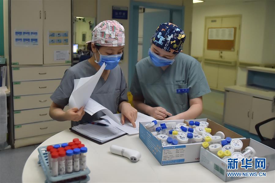 5月11日,在北京地壇醫(yī)院感染二科護(hù)士站,護(hù)士王蕊(左)和石淼在整理病人的核酸樣本。北京地壇醫(yī)院是北京市收治新冠肺炎患者的定點醫(yī)院之一,醫(yī)院的醫(yī)護(hù)人員一直奮戰(zhàn)在抗擊疫情的一線。在國際護(hù)士節(jié)前夕,記者前往北京地壇醫(yī)院,記錄下抗疫一線護(hù)士的日常工作狀態(tài)。新華社記者彭子洋攝