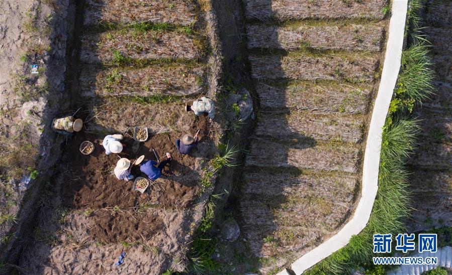 5月12日,青田縣巨浦鄉(xiāng)西坑村的村民在梯田收獲中藥貝母。當?shù)夭扇『献魃缂懈N,冬春種中藥、夏秋種養(yǎng)水稻和田魚的方式,全面提升土地利用率和收益。新華社記者徐昱攝