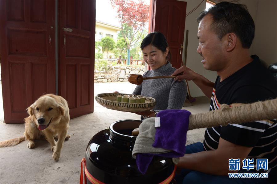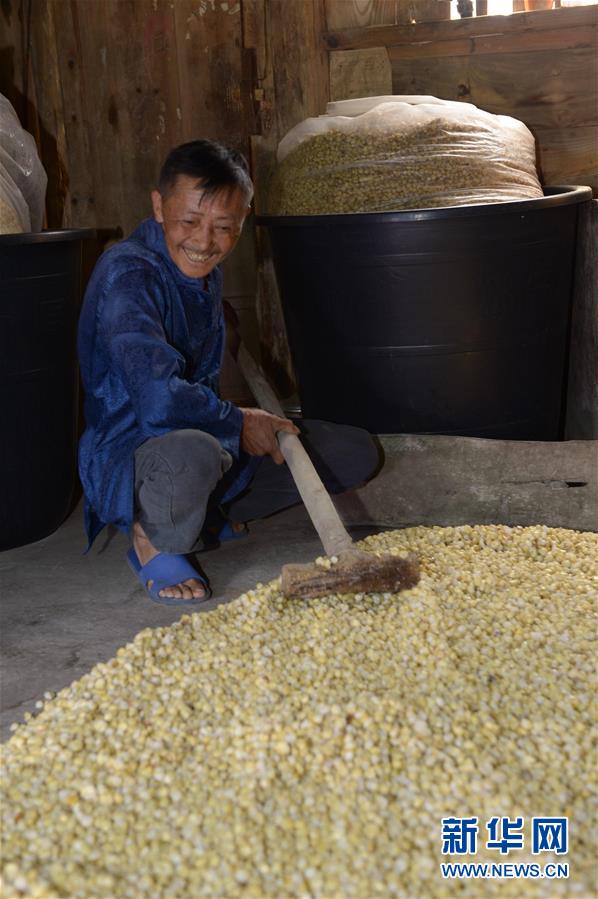 5月14日,在貴州省畢節(jié)市百里杜鵑管理區(qū)黃泥鄉(xiāng)龍?zhí)链逡患揖谱鞣?,村民對玉米進行發(fā)酵。貴州省畢節(jié)市百里杜鵑管理區(qū)黃泥鄉(xiāng)龍?zhí)链宓凝執(zhí)凉啪?,因獨特的古法釀酒技術(shù),口感獨特而遠近聞名。全村有釀酒戶142戶,年產(chǎn)量達45萬多公斤,龍?zhí)凉啪七h銷重慶、廣東、浙江等地,龍?zhí)凉啪埔殉蔀辇執(zhí)寥嗽鍪盏闹匾獊碓础P氯A社記者楊楹攝