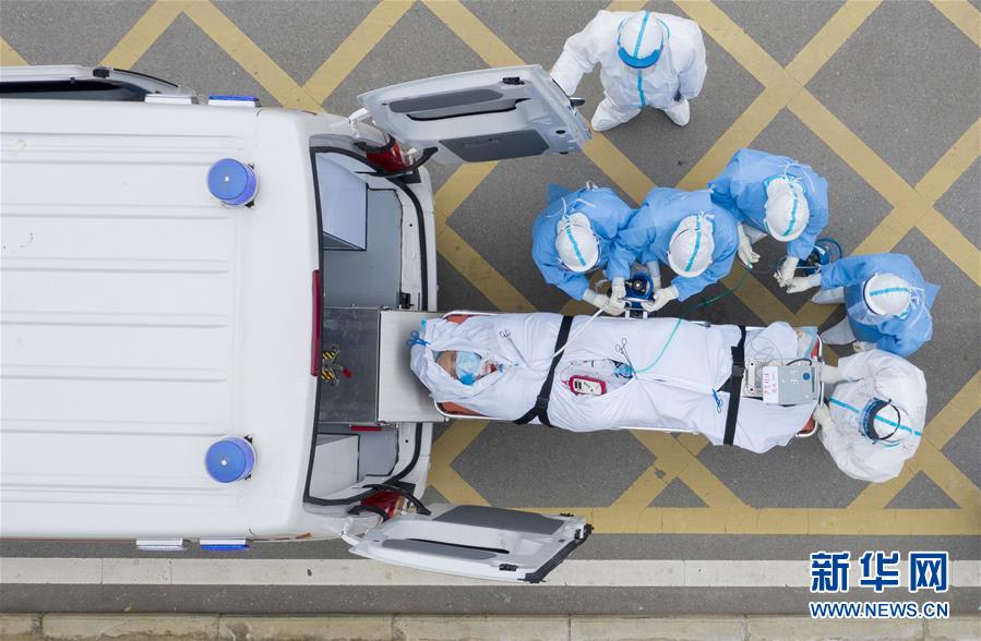 在華中科技大學(xué)附屬同濟(jì)醫(yī)院中法新城院區(qū),醫(yī)護(hù)人員護(hù)送一名剛做完CT檢查的新冠肺炎重癥患者上負(fù)壓救護(hù)車(3月6日攝,無人機(jī)照片)。新華社記者才揚(yáng)攝