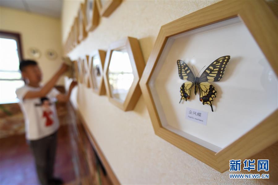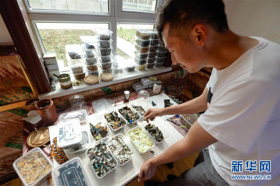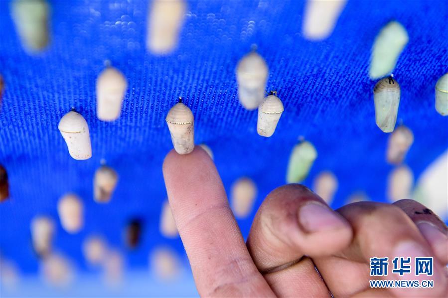 在吉木薩爾縣七彩蝶園,關富云在制作蝴蝶標本(5月15日攝)。走進關富云的七彩蝶園,游客不僅可以近距離接觸翩翩起舞的蝴蝶,還可以欣賞蝴蝶破繭成蝶的蛻變過程。今年34歲的關富云用9年的時間實現了自己的“蝴蝶夢”,完成美麗的“蝶變”。關富云家住新疆吉木薩爾縣北地社區(qū)。2011年,他看到一檔農業(yè)致富節(jié)目,萌生了養(yǎng)殖蝴蝶的想法。關富云說,當時蝴蝶養(yǎng)殖還是一種新興產業(yè),他抱著試一試的想法,在海南學習了3個月蝴蝶養(yǎng)殖,帶回100多個蝶蛹在家試驗養(yǎng)殖。蝴蝶的生存周期短,在當地養(yǎng)殖需要克服溫度、濕度、病蟲害等問題。關富云不斷嘗試,越挫越勇,羽化成功的蝴蝶在2014年終于突破了萬只。蝴蝶的色彩艷麗,活體蝴蝶可用于婚慶、開業(yè)慶典等活動中放飛,可以取得很好的收益。但它的生命短暫,如何才能最大化蝴蝶的效益,留住它的美呢?關富云動起了心思,開始嘗試制作標本和蝶翅畫?!昂宛B(yǎng)殖不同,做蝶翅畫是個創(chuàng)作的過程,從選擇標本到粘貼,每一步都要突出美感?!标P富云介紹,一幅色彩明艷、栩栩如生的蝶翅畫耗時多日才能完成。如今,關富云的活體蝴蝶和蝶翅畫通過線上線下銷售,產品還銷往北京、廈門等地。關富云的蝴蝶產品得到市場的認可,政府也對他給予大力支持。2019年,吉木薩爾縣在泉子街鎮(zhèn)建起蝴蝶觀賞園,吸引了不少游客到此參觀游玩。對于未來的發(fā)展,關富云信心滿滿,“我希望把蝴蝶產業(yè)發(fā)展到天山南北,讓人們在寒冷的冬季也能觀賞到蝴蝶,并且讓更多人參與其中,致富脫貧”。新華社記者丁磊攝