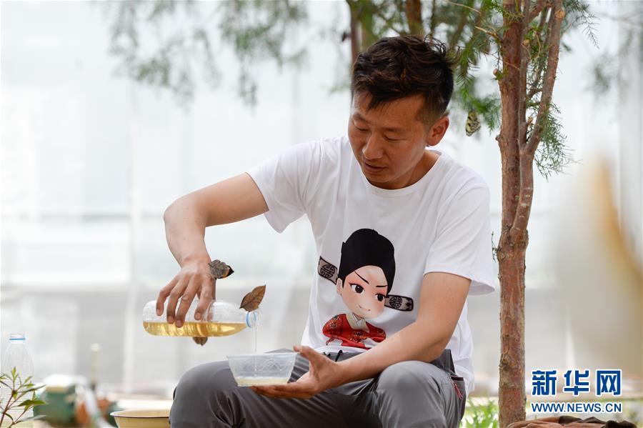 在吉木薩爾縣七彩蝶園,關富云查看蝶蛹生長狀況(5月15日攝)。新華社記者丁磊攝