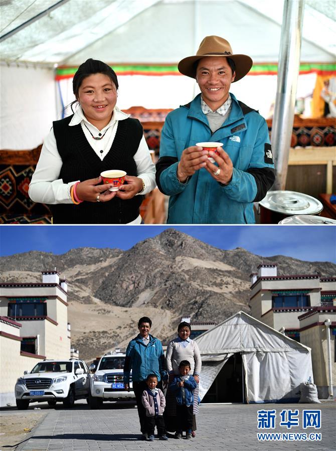 拼版照片上圖:在森布日極高海拔地區(qū)生態(tài)搬遷安置點,格多(右)和妻子洛巴在展示自家打的酥油茶;下圖:在森布日極高海拔地區(qū)生態(tài)搬遷安置點,格多(后左)和妻子洛巴及大兒子扎西尼瑪(前右)、小兒子普巴多杰在帳篷茶館前合影(照片均攝于4月15日)。格多的老家在西藏那曲市安多縣色務鄉(xiāng),一個藏北偏遠的牧區(qū)。2019年底,政府對平均海拔4500米以上的那曲市安多縣、雙湖縣進行極高海拔地區(qū)生態(tài)搬遷。和格多一家一樣,安多縣、雙湖縣搬遷下來的4000余名群眾完成了人生的遷徙,開啟了更加美好的生活。黨的十八大以來,我們堅持以人民為中心的發(fā)展思想,明確了到2020年我國現行標準下農村貧困人口實現脫貧、貧困縣全部摘帽、解決區(qū)域性整體貧困的目標任務。目前看,脫貧進度符合預期,成就舉世矚目。這些成績的取得,凝聚了全黨全國各族人民智慧和心血,是廣大干部群眾扎扎實實干出來的。脫貧摘帽不是終點,而是新生活、新奮斗的起點。新華社記者詹彥攝
