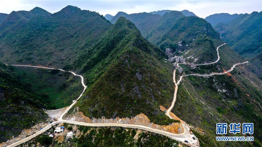 這是在進行路面硬化的大化瑤族自治縣弄合村弄魯屯至弄確屯的山路(5月13日攝,無人機照片)。新華社記者周華攝