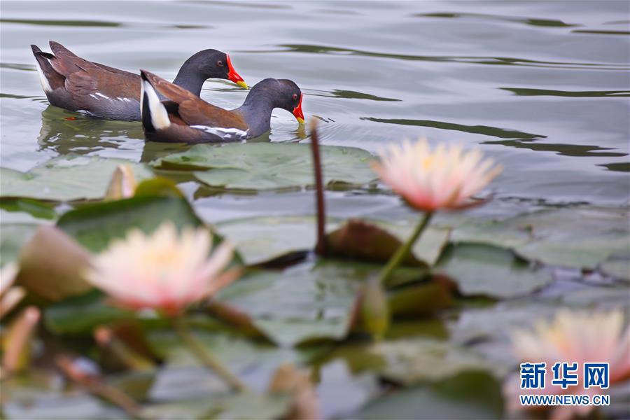 5月22日,兩只紅嘴水雞在蓮葉間覓食。近日,貴陽市觀山湖公園內(nèi)大片盛開的蓮花吸引了不少水鳥在其間嬉戲覓食。新華社記者劉續(xù)攝